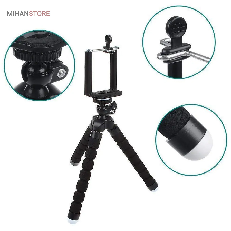 اگر دنبال یک سه پایه گوشی برای فیلمبرداری و عکس برداری هستید که در محیطهای متفاوت بتوانید از آن استفاده کنید و ارزان قیمت هم باشد سه پایه عنکبوتی یا همان spider یک گزینه اقتصادی و عالی است.  این سه پایه دارای پایه های منعطف بوده که قابلیت تغییر جهت را دارد و می توان آن را به سطوح مختلف نصب کنید.  از این سه پایه می توان برای نمایش فیلم نیز استفاده کرد.جنس سه پایه مدل Spider  از پلاستیک فشرده ومقاوم است که جنسی مقاوم و سبک وزن است و با سایر سه پایه ها تفاوت دارد. حداقل ارتفاع آن 31 سانتی متر است در حالت باز به همراه مساحتی حدود 5 تا 10 سانتی متر اشغال میکند. میزان تحمل وزن این سه پایه سبک 1000 گرم است و این نشانه میزان قدرت پایه ها Spider tripod  است. هم چنین از طریق بال هد کوچک روی آن می توانید زاویه مورد نظر را تنظیم کنید.