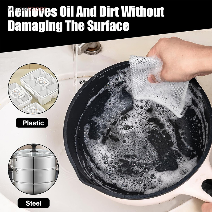 قدرت تمیزکنندگی بالا: این اسکاچ و دستمال توری با قدرت پاک‌کنندگی بالا، به راحتی چربی‌ها، لکه‌های سخت و آلودگی‌ها را از بین می‌برد و نتیجه‌ای تمیز و درخشان به جای می‌گذارد.