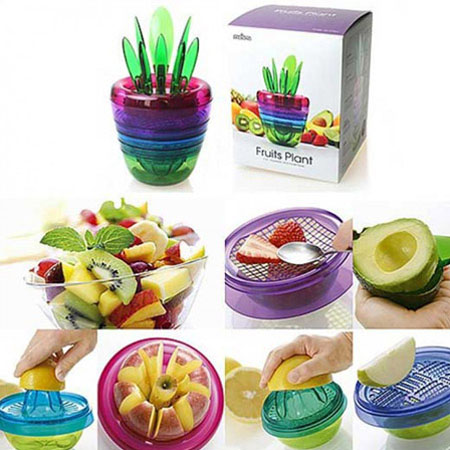 گلدان جادویی Fruits Plant یک محصول بسیار کابردی است که دارای طراحی عالی و هوشمندانه ای می باشد. این محصول 10 کابرد مختلف دارد که از کاربرد های آن می توان به: آبگیر لیمو، قاچ کن سیب، صفحه برش توری، رنده توری شکل، آبگیر گریپ‌فروت و ... اشاره کرد. جالب است بدانید برگ های این گلدان هم کاربرد های مختلف دارد! 2 برگ برای برش لیمو و 4 برگ کوچک بعنوان چنگال طراحی شده اند. این گلدان هم یک دکوری فانتزی و شیک برای آشپزخانه شما می باشد و هم یک وسیله 10 کاره بسیار کاربردی!