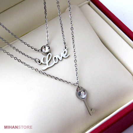 دارای گردنبند سه زنجیره با آویز های نگین، Love و کلید